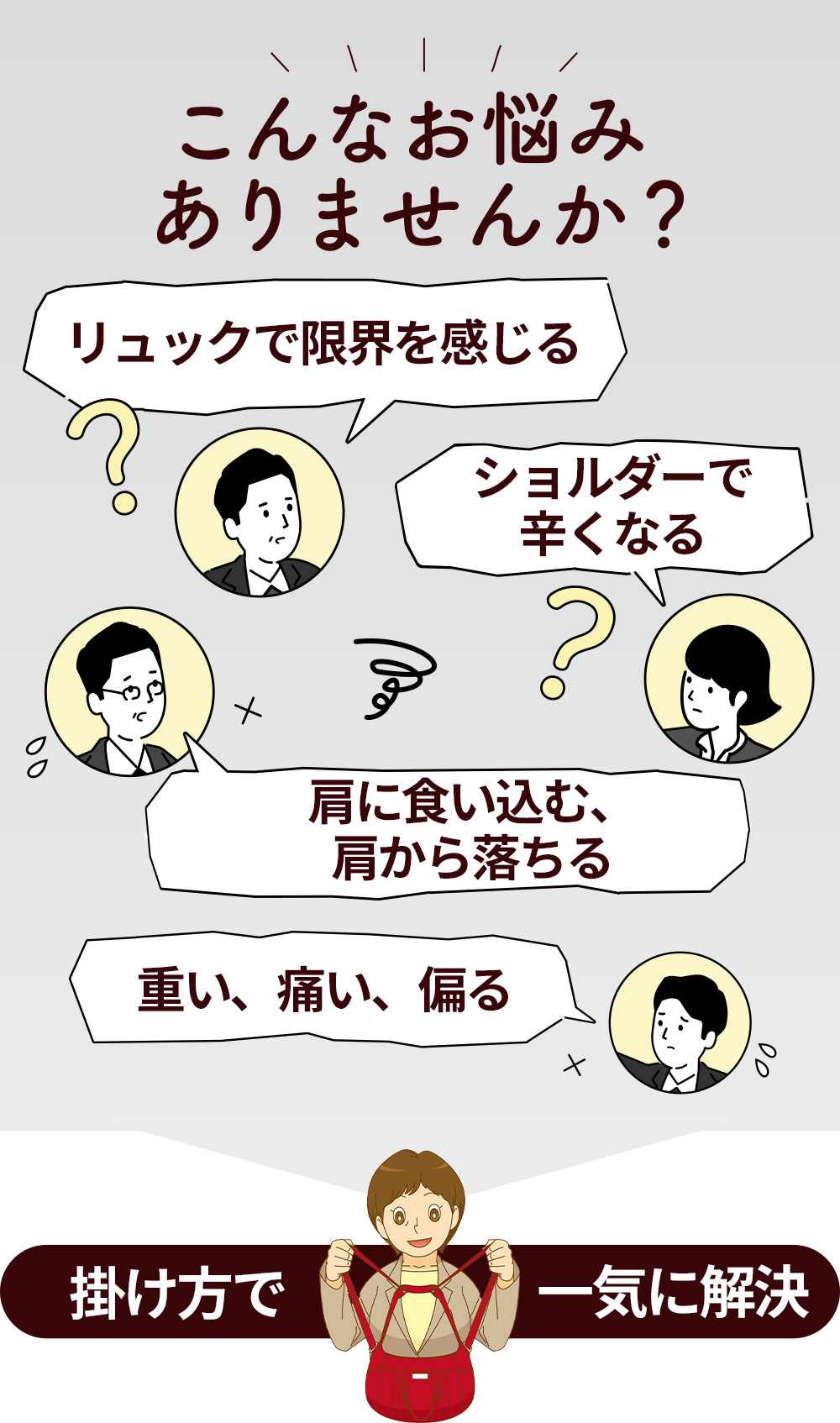 2023.04.14なるほどコアルー 自分のカバンも5wayになれたら…なれます! Tweet Share Hatena Pocket RSS feedly Pin it Q.リュックでかなり下だけど、重くないの?パタパタしないの? かけてみるまでは大丈夫?と心配だったけど、あれ?案外軽いしベルトの食い込みも気にならない。 不思議に思いました。体に重心に近い所に重さが来ているから? 歩く時に後ろに持っていかれる感じが無くむしろ安定。 走ると少々揺れる程度で想像以上にフィットします。 (2015年8月 埼玉の主婦) Q.5つもの掛け方って全部要るの? テレビで見て衝撃を受けました。これはすごいかも!と即購入。 商品そのものがテレビで映った時よりもしっかりしていました。 最初は面白くてわざわざリュックにしたりメッセンジャーにしたり説明書をみながら一所懸命に変身してみたけど 結局は斜めだけでも十分ラクだし自転車ではリュック、電車では前、主に3つの掛け方だけ使っています。 (2021年12月 京都の60代女性) Q.肩こりがひどいんだけど・・・ 元々肩こりで数年前からは腰も悪くなって整骨院通いです。 先生からはリュックにしなさいと言われたけど、結局腰が悪くなってからはリュックも負担に感じるようになっていたところ、コアルーバッグに出会い、藁をもつかむ気持ちで購入しました。 それからというもの、これが無いと出かけられないぐらい。 今では整骨院の先生に教えてあげたくなるぐらいです。笑 無くならないでほしい、困ります! (2022年3月 東京都40代会社員) Makuakeで目標達成後、予約販売中! ✔ 自分のバッグに付け替えると、たちまち5通りの掛け方にカンタン変身! ✔ より軽く、丈夫に、使いやすくなった5WAY楽ちん「コアルーストラップ」 ✔ 様々なバッグに合わせやすく、ビジネスからファッションまで広く使える! ただいまMakuakeで超改良版の予約販売中! ママになったら荷物はふえるわ、肩は凝るわで大変でした。 リュックも、ショルダーもイマイチでその両方を合わせた形は無いの? と悩んでいたら、降ってきたかのように閃いたのでした! コアルーバッグとコアルーストラップで皆が便利に、ラクになりますように。 次回放送:8月31日(木)AM6:00 「番組お知らせ登録」が便利です。 Tweet Share Hatena Pocket RSS feedly Pin it 投稿者: cha31643 なるほどコアルー コメント: 0 便利なマザーズバッグをお探しの方に これ良いな!!とピンと来て購入 関連記事一覧 ユーザーのTさまより【リハビリ中の母にコアルー】 ユーザーのTさまより【介護にコアルー】 ワークマン女子のショルダーを大改造! 吉祥寺店舗での出来事 頸椎の痛みがラクに?! ユーザーのTさまより【松葉杖にコアルー】 前抱え、こんなに楽なんだ! コメント ( 0 ) トラックバックは利用できません。 この記事へのコメントはありません。